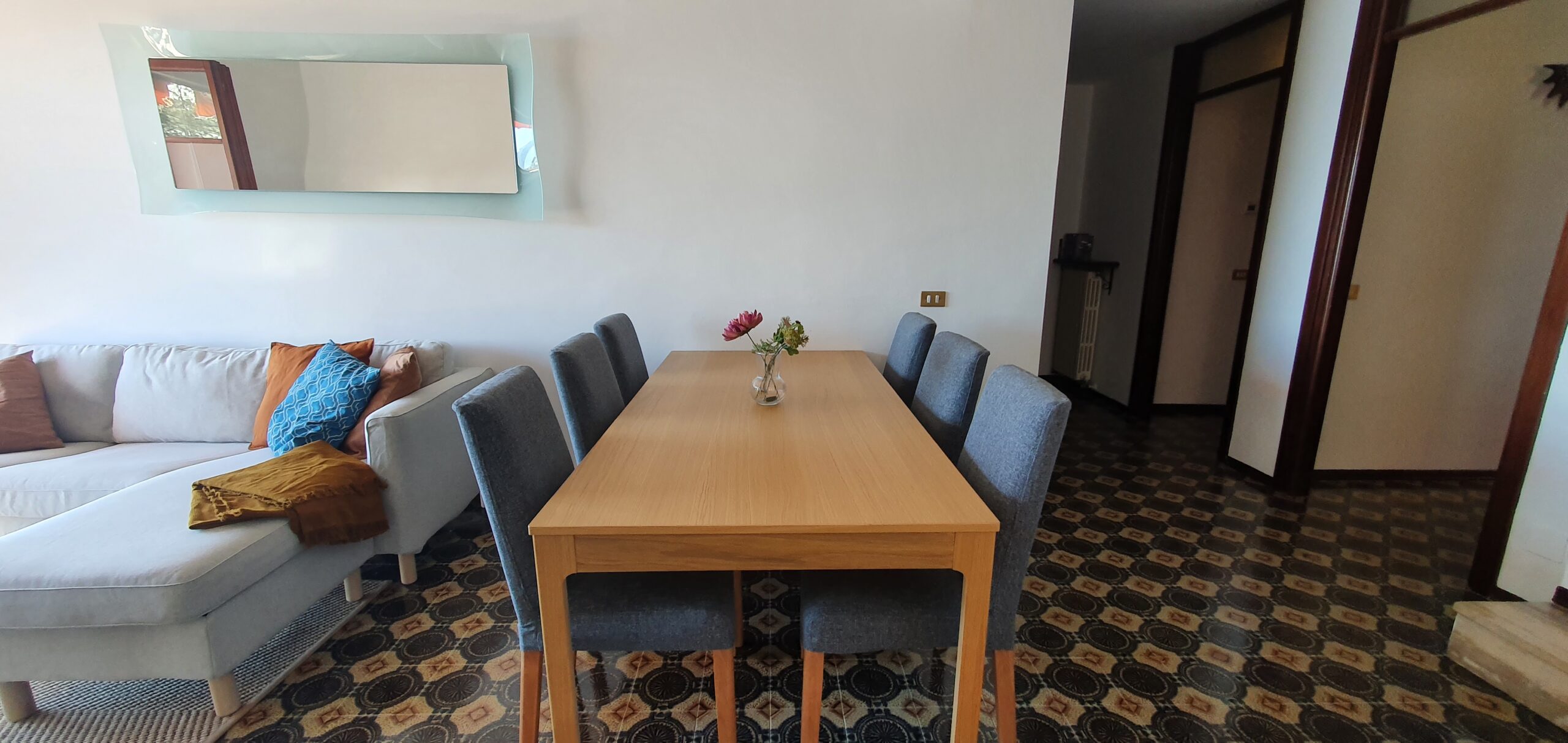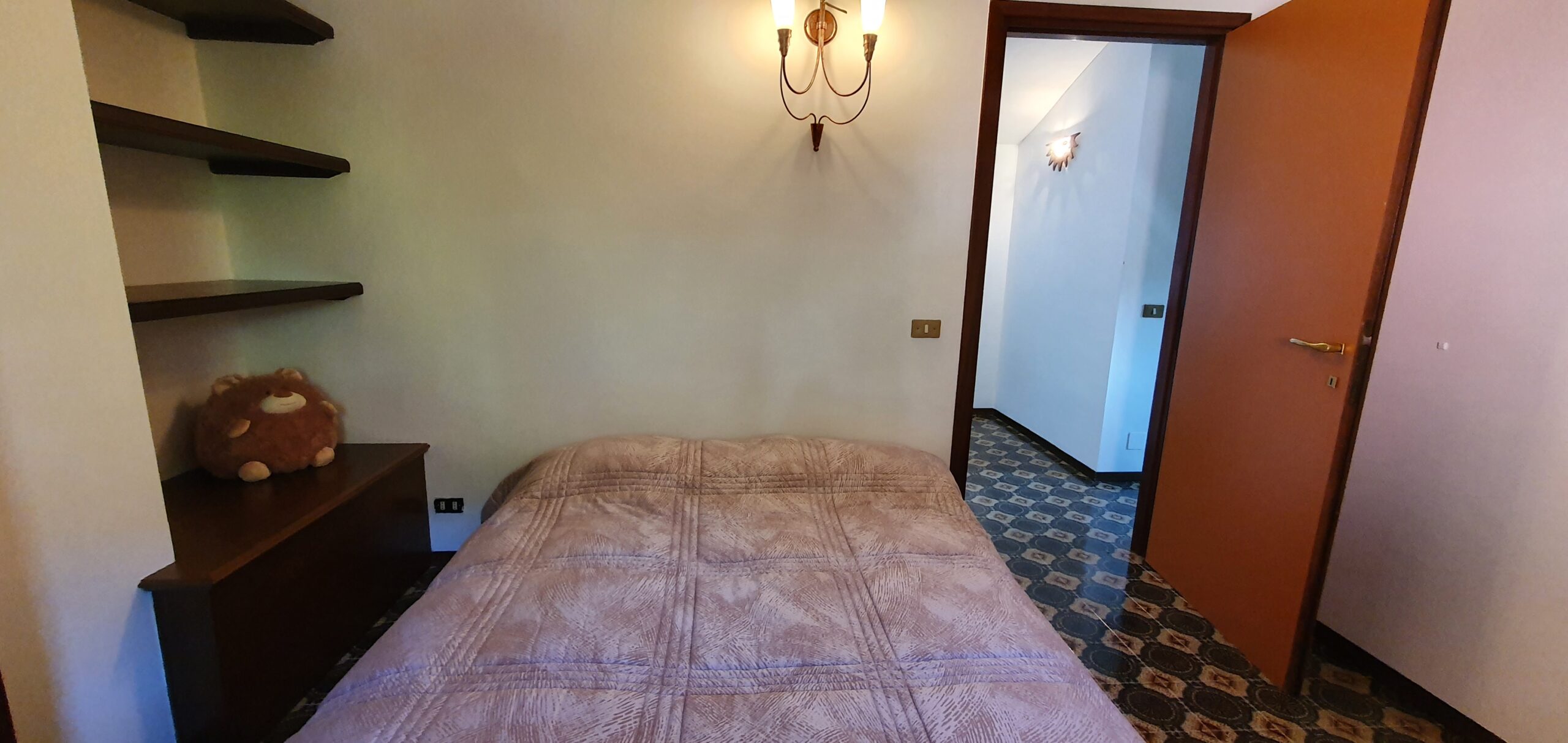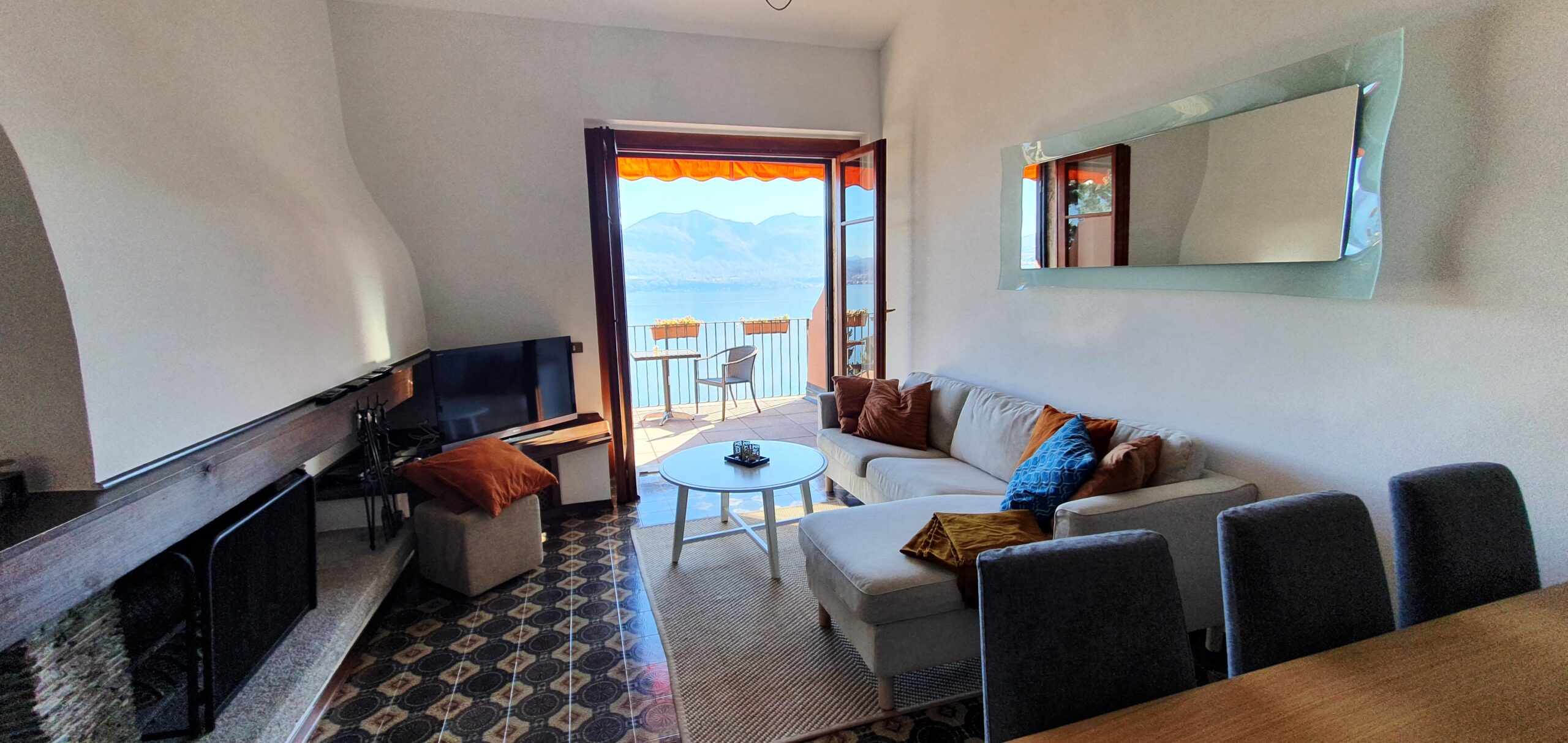 Lejligheden ligger på sjette sal i et feriekompleks og er fordelt på to etager. Her er tre soveværelser, to badeværelser og en stue. Det mindste værelse på første sal har to enkeltsenge, der lige nu står samlet som en dobbeltseng. Fra stuen er der adgang til en balkon med en fantastisk udsigt over Lago Maggiore.