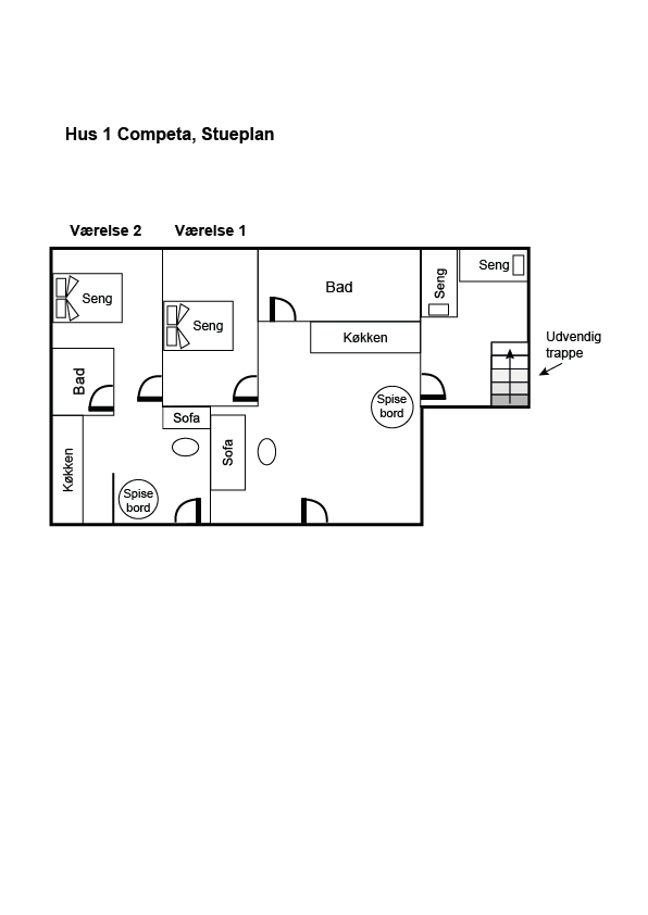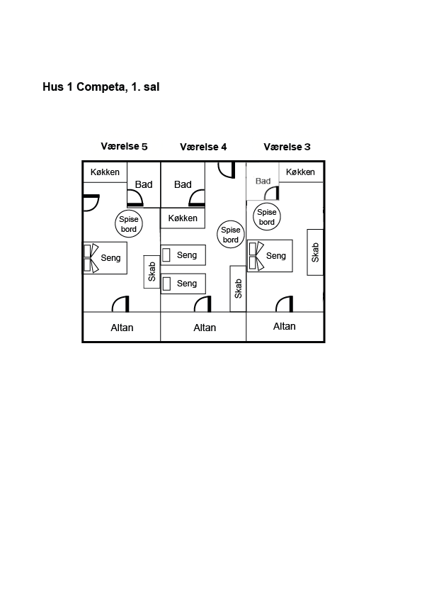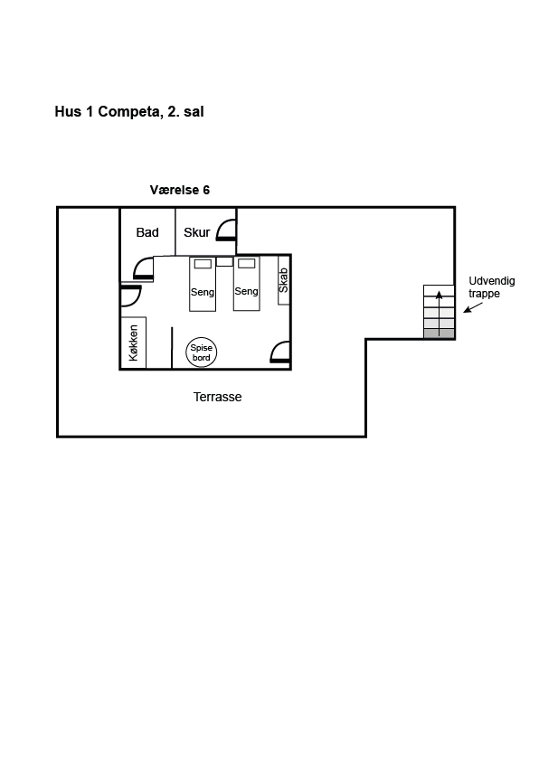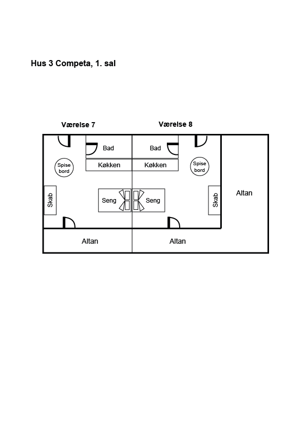 Værelser 7-8 er beliggende over fælleskøkken/spisestue og har adgang ad udvendig ståltrappe, som kan være glat i fugtigt vejr.
